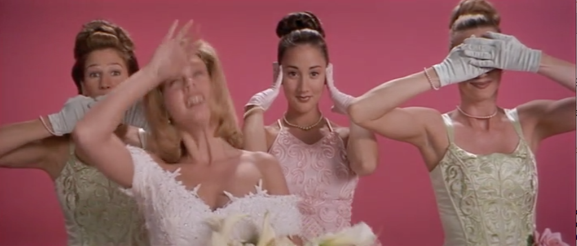In the most orgasmic, come-hither vocals she can muster, edgy true-indie rocker DiFranco covers “Wishin’ and Hopin,” a Hal David/Burt Bacharach song made popular by Dusty Springfield in 1964.  As she sings, one “bride” (played by Raci Alexander) and her three “bridesmaids” (Jennifer Garrett, Kelly Sheerin, Bree Turner) lip-synch to the easy-listening hit while daydreaming of how great it would be to be married.  Just so there is no confusion, the bride is blonde and the brunette bridesmaids wear either Easter green or pink dresses.  Their feigned mindsets, as well the brunettes’ hairstyles wrapped up in buns, are very traditional, as they go through the motions of engagement and preparing for the wedding, including pulling up the garter, the bouquet toss, and the bridal walk.